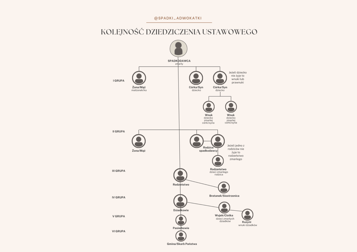Na przygotowanym przeze mnie diagramie przedstawiam hierarchię dziedziczenia ustawowego oraz grupy spadkowe.